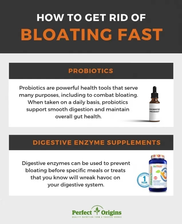 In addition to probiotics, digestive enzymes can be used to prevent bloating before specific meals or treats that you know will wreak havoc on your digestive system.